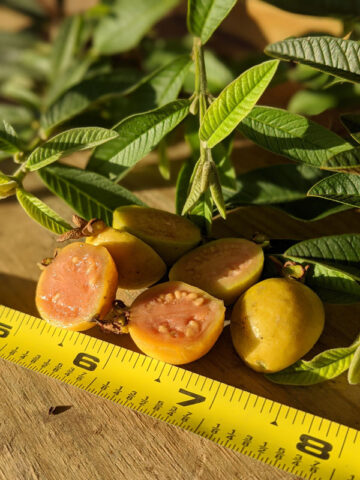 Before leaving, Guava are inspected, watered, and pruned. Larger plants, generally those that ship in 8″ pots, will be topped to 36″ or 48″ overall, depending on the variety, if necessary, to facilitate shipping. Your new plants’ pot is then bagged to ensure that the soil stays in the pot and not loose in the box. Plants are tissue or kraft paper wrapped and generally secured in place with natural biodegradable peanuts.