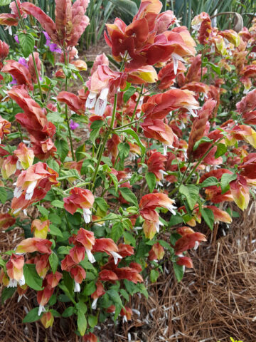 Growing with spindly branches covered in oval green leaves the little white flowers extend from pale pink bracts, slightly resembling a raw shrimp, hence the common name of shrimp plant. The flowers emerge from bracts that form off the stems. These are very healthy plants with well established root systems.