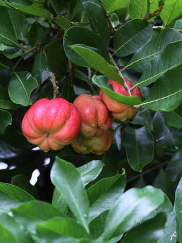 Native to the Gold and Ivory Coast’s of Africa, Akee is a beautiful tree with a short trunk, a dense crown of spreading branches and a canopy of bright green glossy leaves. A lover of warm temperatures fragrant Akee flowers appear in spring spreading a blanket of white across the tree. Fruit produced is pear shaped with a leathery scarlet exterior. Not ripe until it splits open, reveling the 3 creamy colored glossy arils that are crisp and have a slightly nutty flavor. The shining seeds also contained, should not be consumed. Beautiful as an ornamental shade tree. Fruit must be cooked.