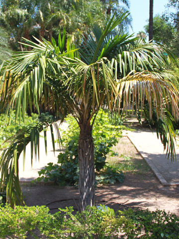 Rarely offered and unknown to most landscapers, the Parrot palm is the perfect palm for adding a highly tropical look to a relatively small space. Though related to the Queen, this palm is very distinctive with persistent leaf bases that spiral around a relatively narrow trunk while it's crown erupts with over-sized, glossy 6 foot fronds.