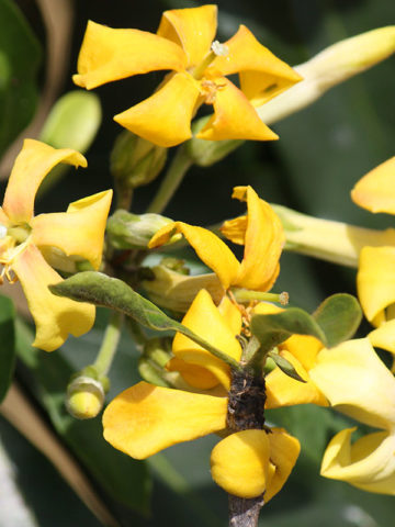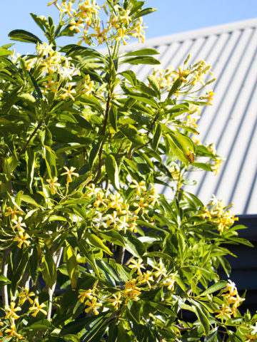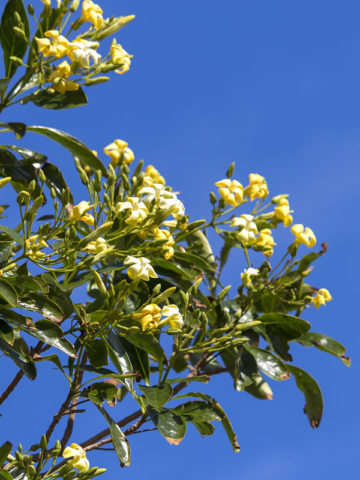 A very rare must have tree. Massive clusters of highly fragrant, plumeria-like flowers, blooming white and turning yellow, blanket the tree and perfume the surrounding area. Large, glossy leaves give this Australian native tree a tropical feel. Compact in nature, it’s a perfect candidate for a smaller urban garden where space is a commodity. Mature it can grow to about 20 to 25 feet high. What a spectacle to see when it is in bloom.