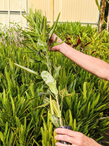 Before leaving, Croton plants are inspected, watered, and pruned. Larger plants, generally those that ship in 8″ pots, will be topped to 36″ or 48″ overall, depending on the variety, if necessary, to facilitate shipping. Your new plants’ pot is then bagged to ensure that the soil stays in the pot and not loose in the box. Plants are tissue or kraft paper wrapped and generally secured in place with natural biodegradable peanuts.