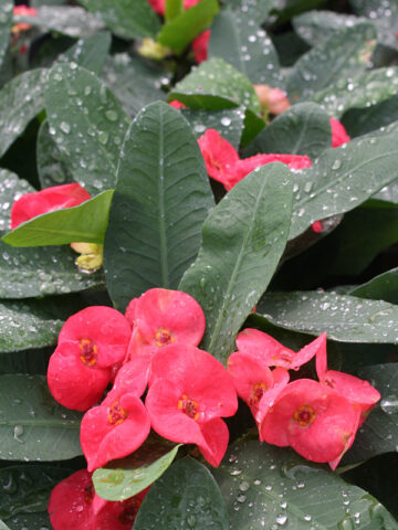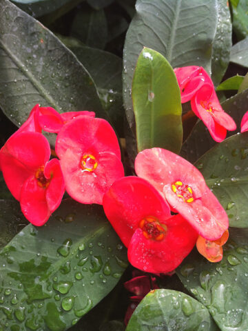 Large clusters of neon pinkish-red blooms adorn this tropical succulent year round. Thai crown of thorns feature one of the largest blooms of the crown of thrones family along with large leaves and stems. Crown of thorns is an excellent plant choice for courtyards and sun rooms where exposed to warmth and bright light to achieve full bloom potential. Flower coloration may vary slightly in different growing environments.