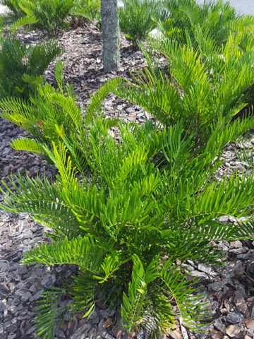 The feather-like, light green, leathery foliage of Coontie emerges from a large underground storage root in the early years before a trunk develops forming a colony of suckers that will slowly grow into mounds 5 tot6 ft wide. The evergreen leaves are fine in texture and resemble fern leaves. Coontie's unique growth habit is ideally suited for use as a specimen or container planting and is a great addition to the urban garden.