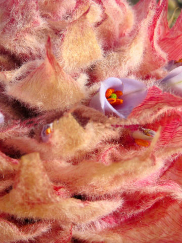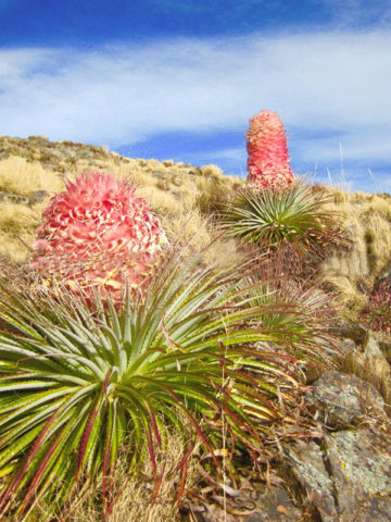 An absolutely spectacular bromeliad from dry, rocky, high elevation grasslands of the Andes in Argentina in the provinces of Salta and Tucumán. It forms a compact rosette of narrow leaves that are light green and red tipped above and silvery below. It produces a massive, short-stalked inflorescence that is densely covered in bright pink, densely wooly bracts. Puya weberiana has not been in cultivation before but would likely succeed in cool Mediterranean climates such as coastal California.