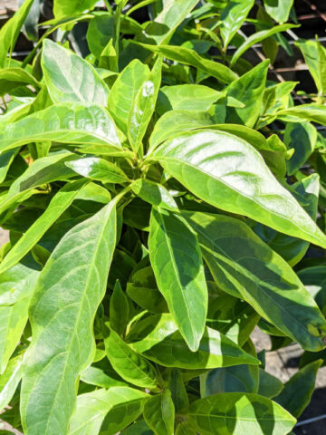 Before leaving, Graptophyllum plants are inspected, watered, and pruned. Larger plants, generally those that ship in 8″ pots, will be topped to 36″ or 48″ overall, depending on the variety, if necessary, to facilitate shipping. Your new plants’ pot is then bagged to ensure that the soil stays in the pot and not loose in the box. Plants are tissue or kraft paper wrapped and generally secured in place with natural biodegradable peanuts.