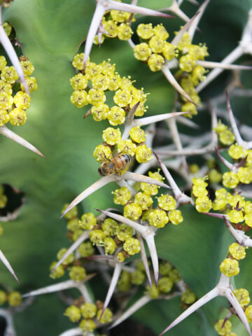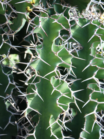 Spiky and Spiny Triangular stems are edged with rather sharp dark gray double spikes all down the entire length creating an ominous appearance. Once a year the margins explode in beautiful bright yellow flowers. When full size Grandicornis can reach 6 feet in overall height and spread up to 6 feet. The sunny spot in the yard or on the urban patio will become home for Cow Horn. Plant in multiples in close proximity they make an impenetrable smaller hedge or border.