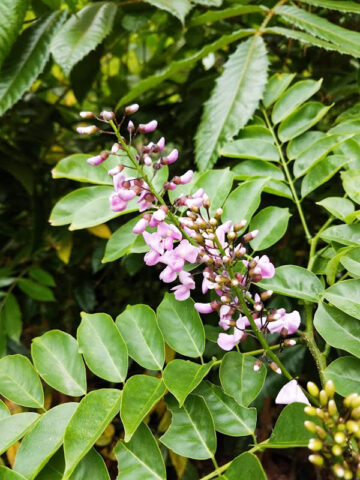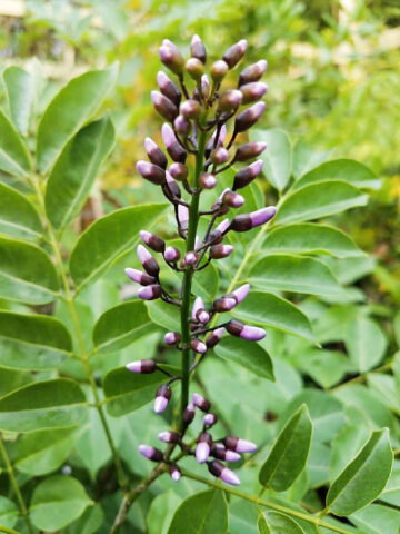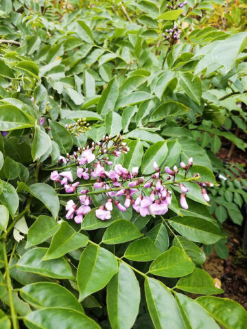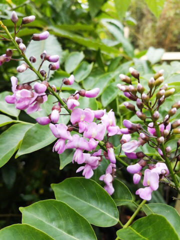 Sweetly-fragrant, pea-like lavender blooms resembling lilacs blossom from 6 to 10 inch upright bunches in the late spring. A very attractive tree with lacy leaves and strikingly colored flowers, in the landscaping it can be grown as a specimen, accent or shade tree or trimmed to be a shrub in the smaller urban garden. Leaves are evergreen, pinnate, smooth, dark green above, paler beneath and grow on slightly drooping branches forming a shady dense crown.