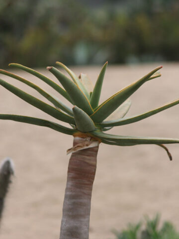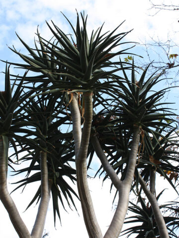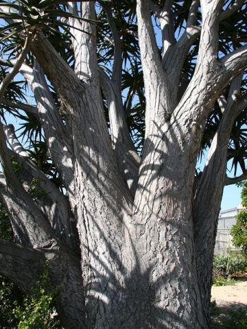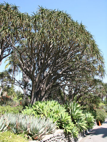 STRIKING! Aloe Bainesii native to more arid climates, this statuesque, beastly, large succulent flowering tree can grow to heights of 50+ feet. Considered a solitary, gray mottled trunk tree it grows forked branches that sport recurved dark green leaves. This tree grows and enormous base that is unbelievable for an aloe up to 3 feet in diameter. The only aloe tree to bloom in pink shades, the racemes branch and are covered in spirals of tubular flowers that range from rose pink to salmon with green-tips. A handsome plant for the drought tolerant garden.