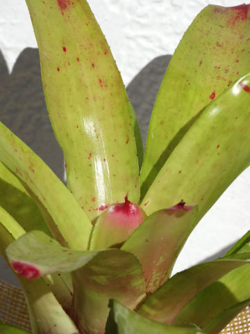 Pink spotted light green, short leaves are tipped in pink on this compact bromeliad. The center of the rosette or the base of the leaves is a bright pink to lilac coloration, making this a great eye-catcher in the garden or collection. This central coloration becomes more prominent in full sun.