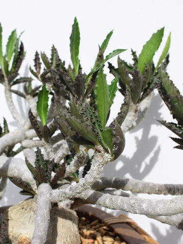 This amazing plant forms a fat base (caudex) of varied shapes and sizes that only gets larger over time creating an almost cartoon appearance. Thick leathery dark green narrow wavy edged leaves form off of long tentacle like branches. Unassuming flowers in light brown emerge among the leaves giving the plant an alien appearance. Great for any gardener from novice to expert.