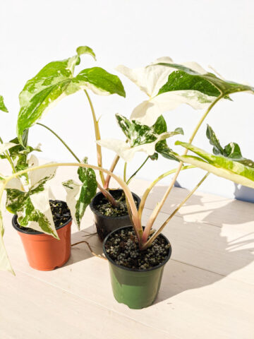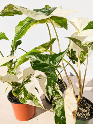 Before leaving, White Knight Albo Variegata Syngonium plants are inspected, watered, and pruned. Larger plants, generally those that ship in 8″ pots or with totems, will be topped to 36″ or 48″ overall, depending on the variety, if necessary to facilitate shipping. Your new plants’ pot is then bagged to ensure that the soil stays in the pot and not loose in the box. Plants are tissue or kraft paper wrapped and secured in place with natural biodegradable peanuts.