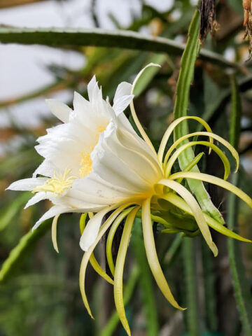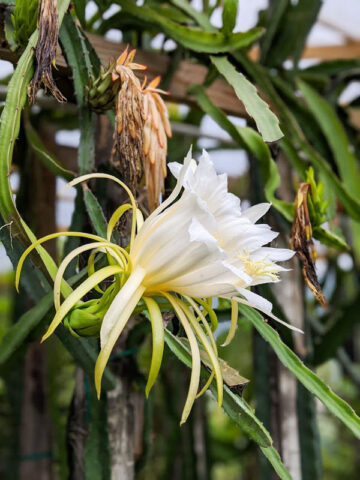 When you receive your new Dragon Fruit Cactus, there is no need to worry about planting right away. Your new plant can be stored for a while by simply placing it in a bucket and moving it to a shady location, simply water when dry. This will give you plenty of time to select the ideal location for your new Dragon Fruit Cactus. This Dragon Fruit Cactus in particular is well rooted, grown and shipped in a 2″x 2″x 7″ tall pot allowing for deeper roots and faster growth.