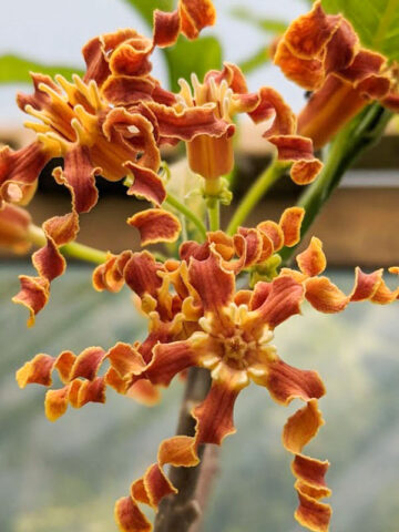 The growth rate of Madagascar Corkscrew Flower will vary greatly depending on soil type, sunlight, temperature and other factors. A few leaves are often trimmed prior to shipping to reduce transpiration and travel stress.