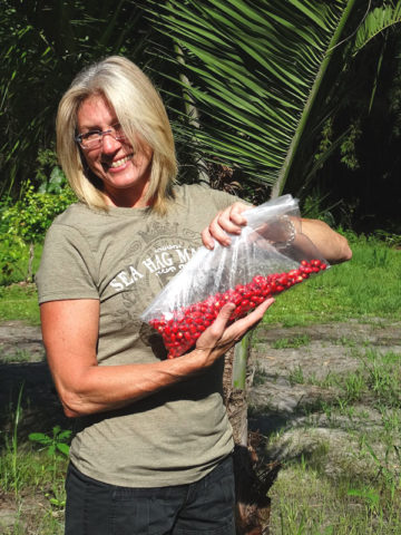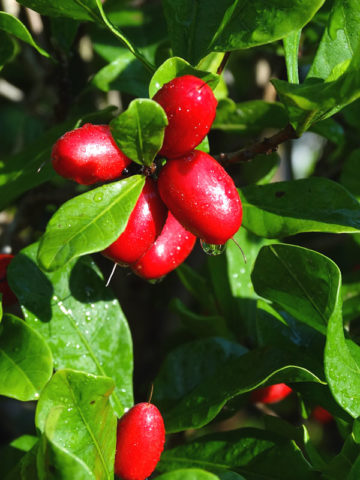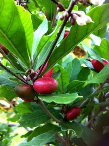 Juicy Miracle fruit, an evergreen bush, is a marvelous conversation plant that does well in a container. The plant has deep green, elongated leaves which grow in a spire-like habit and small 1/4 inch white flowers are produced in flushes throughout the season. The fruit is a small bright red, ellipsoid berry containing a single seed. Although mildly sweet itself, when a single fruit is eaten and the fleshy pulp allowed to coat the taste buds of the tongue and inside of the mouth, an extraordinary effect occurs for around 30 minutes to an hour. You can now eat a lemon or lime or any sour food and it will taste as if it was coated in sugary goodness. Amazing!