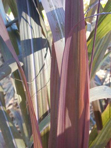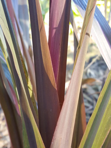 XL Peles Smoke Sugarcane Plant, A true ornamental, but edible sugarcane! The strap-like leaves begin deep green and immediately turn a dark smokey purple. This is a dwarf, smaller cane variety better suited to patio container growing than the more common commercial cane. The small stand shown here, was discovered at EARTH University, located in Guácimo, Costa Rica.