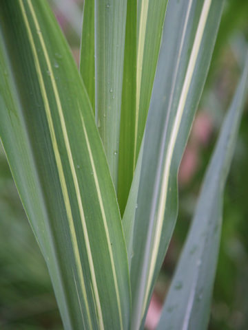 XL Hawaiian Sugarcane Halali Plant, Blade like light green and white striped leaves top tall slender canes striped with pale green pink and yellow. New shoots emerge with a light white powdery coverage.