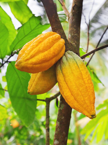 Grow your own Chocolate at home! A small, tropical evergreen, up to 25 feet, with thick, oblong-oval, leaves. In a 24” container, kept trimmed to 6' this tree often produces 5 to 10 pods annually. The cacao “beans” are produced in large, angular orange-ish capsules, up to a foot long and 4 inches diameter. The capsule rind is thick, hard and leathery. The capsules grow along the trunk and main branches. The beans, or seeds, about an inch across, range from 20 to 40 per capsule, and are embedded in an acid, fleshy pulp. After removal from the capsule, the beans are washed or fermented to remove the mucilaginous pulp. Chocolate is the sweetened or unsweetened product of the roasted and ground beans, with most of the fat retained.