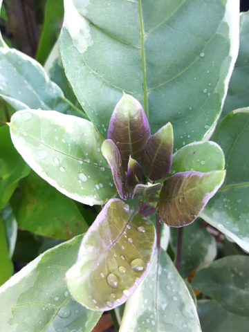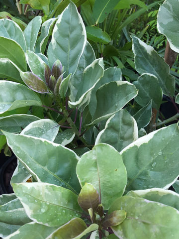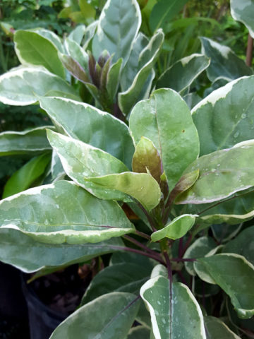 HUGE cup shaped yellow flowers with 5 evenly spaced maroon stripes burst from branch tips amidst pale green and white margined and splotched leaves. The spectacular flowers open to almost 6 inches wide and 7 to 8 inches long in a breath-taking display during the spring. The variegated foliage springs from long, meandering branches that are easily trimmed to form a well behaved shrub. What a wonderful plant for the urban landscape or patio with a trellis.