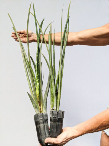 Before leaving, Sansevieria are inspected, watered, and pruned. Larger plants, generally those that ship in 8″ pots, will be topped to 36″ or 48″ overall, depending on the variety, if necessary, to facilitate shipping. Your new plants’ pot is then bagged to ensure that the soil stays in the pot and not loose in the box. Plants are tissue or kraft paper wrapped and generally secured in place with natural biodegradable peanuts.