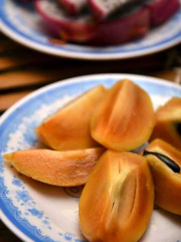 Manilkara is a fairly fast-growing, long-lived tree, upright and elegant, distinctly pyramidal when young and capable of reaching 40 feet when full grown. It is strong and wind- resistant with highly ornamental, glossy evergreen leaves. Small bell like flowers, bloom on slender stalks from the leaf base. Fruit varies in shape but is generally orb like with a smooth skin when ripe. Juicy, pear-like flavor is found in the interior with the yellowish brown to reddish brown flesh. The fruits mature 4 to 6 months after flowering and should be eaten when the pulp is soft-firm.