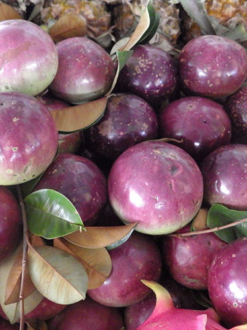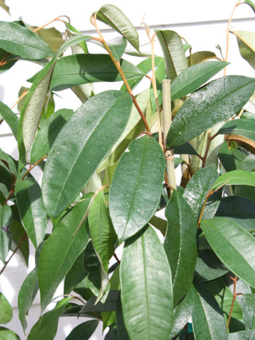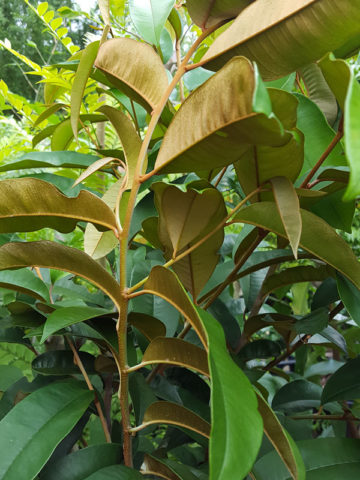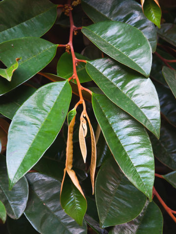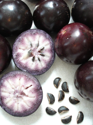 Also know as a Golden Leaf Tree due to the sharp contrast of colors between the deep glossy green top and the silky golden yellow bottoms of the leaves. Full size trees have been recorded growing as high as 100 feet tall with short trunks growing to 3 feet wide. Inconspicuous tiny purplish-white flowers bloom with a delicate sweet fragrance. Ornate round rubbery skinned fruit are produced around year 7 and ripen to a regal purple. While the skin is not edible the interior flesh is soft and sweet and has a distinct asterisk star shape when cut cross section.