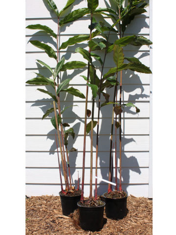 RARE! Etlingera with sunset colored leaves. Stems can grow to great heights of 18 – 20 feet and sport 3 foot long leathery leaves that are dark green above and reddish purple below. In late summer/fall flower stems arise and can be 3 – 6 feet in height. Atop the lofty stem is a red waxy flower cluster which reminds one of a lit torch. This is among the worlds most tropical looking exotics.